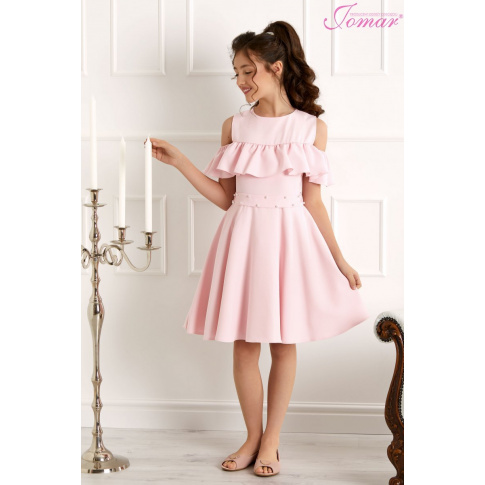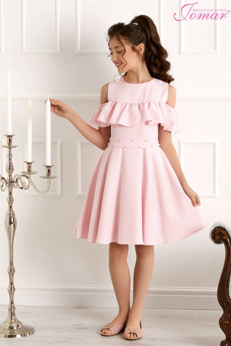 • sukienka ozdobiona falbanką i perełkami w pasie