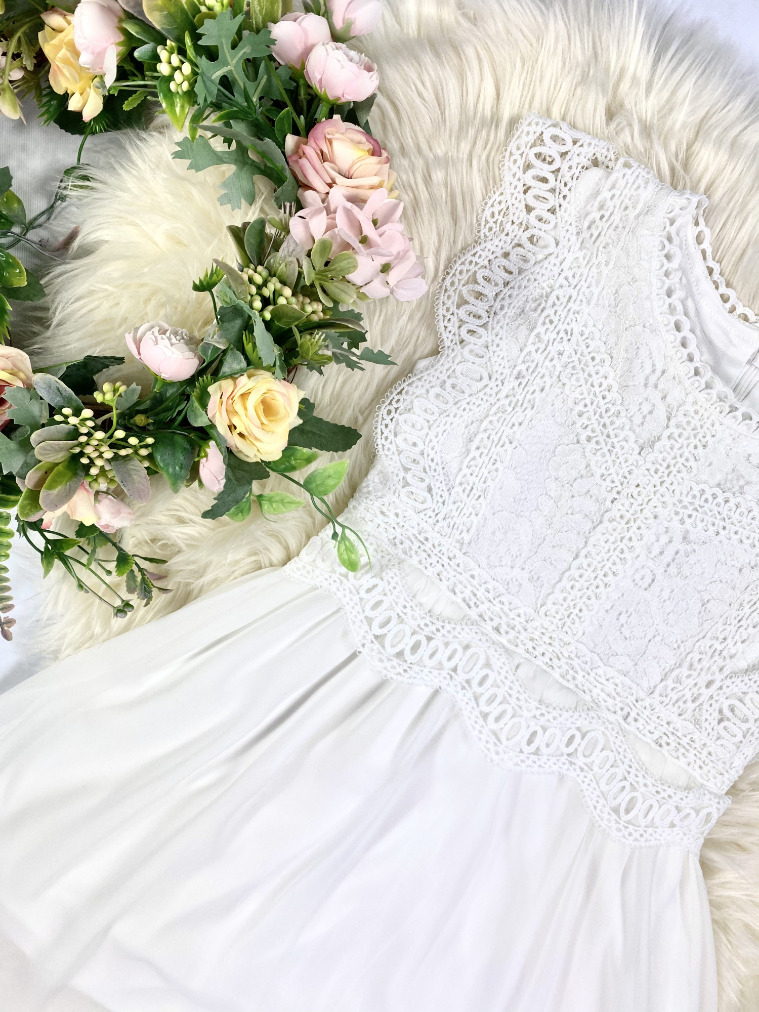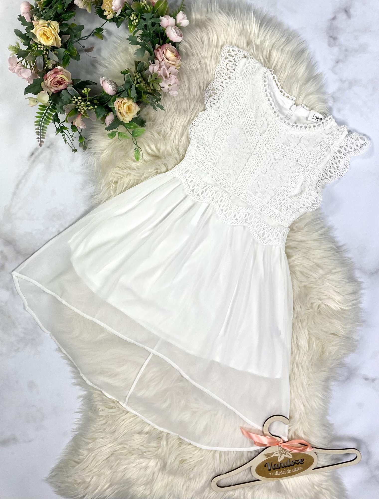 - w górnej części po bogach sukienka posiada falbanki z koronki nadające uroku