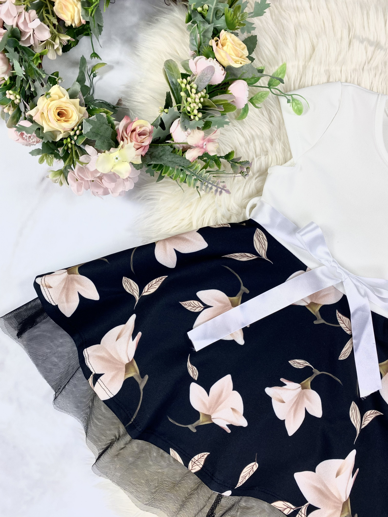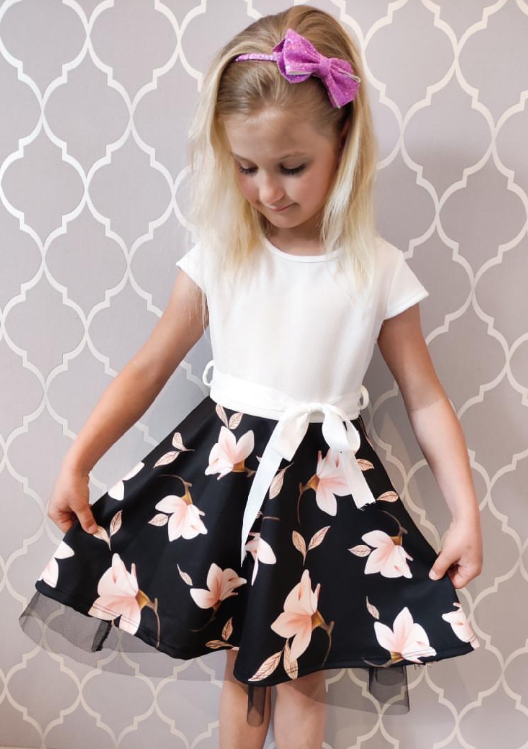 - dół sukienki zdobiony pięknym liliowym motywem oraz tiulem