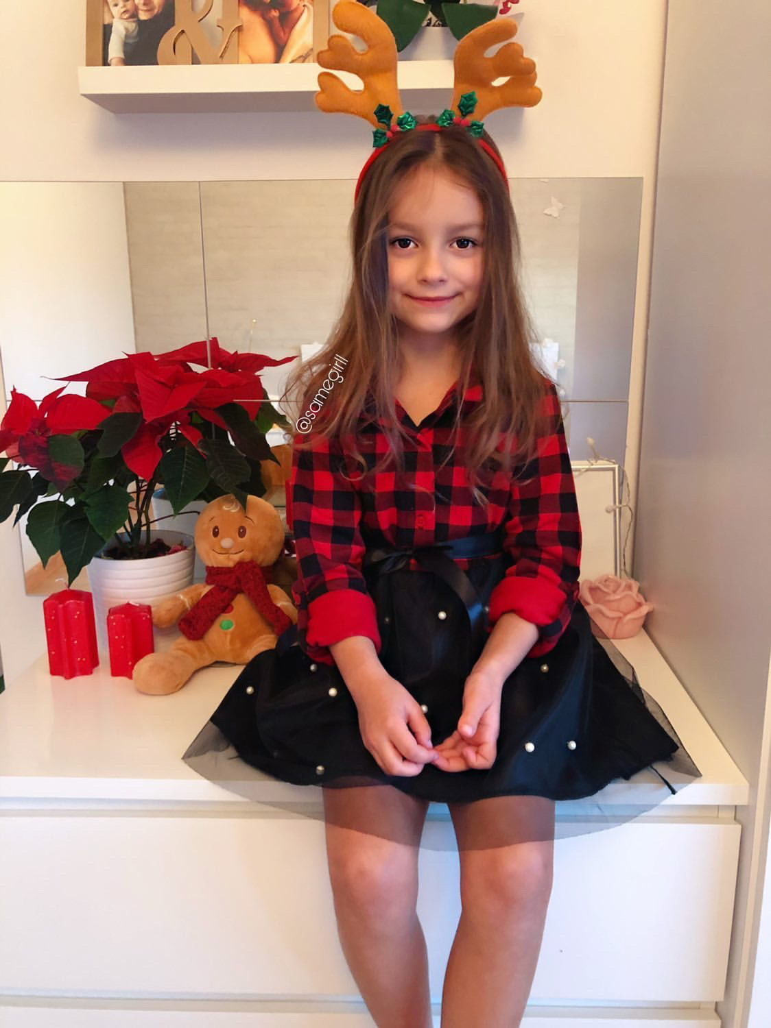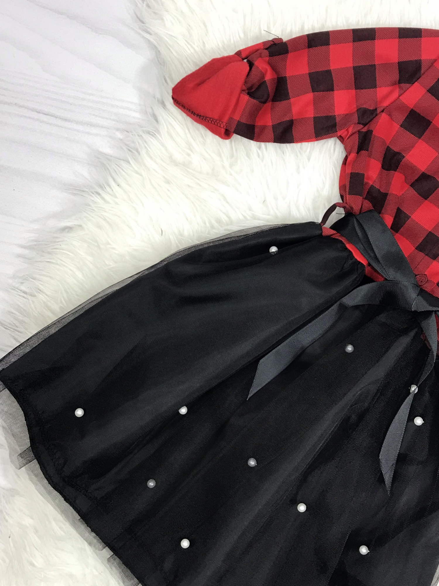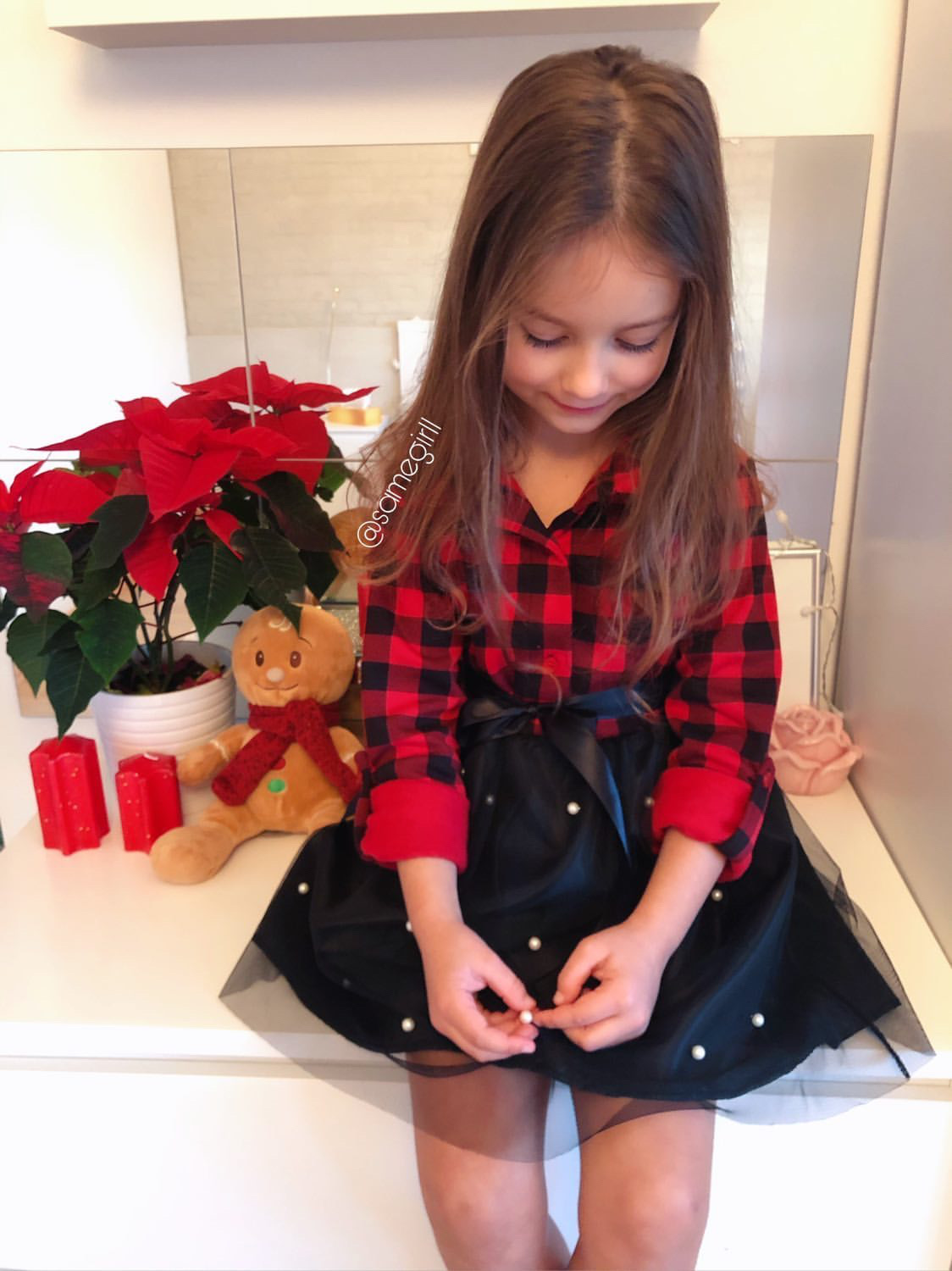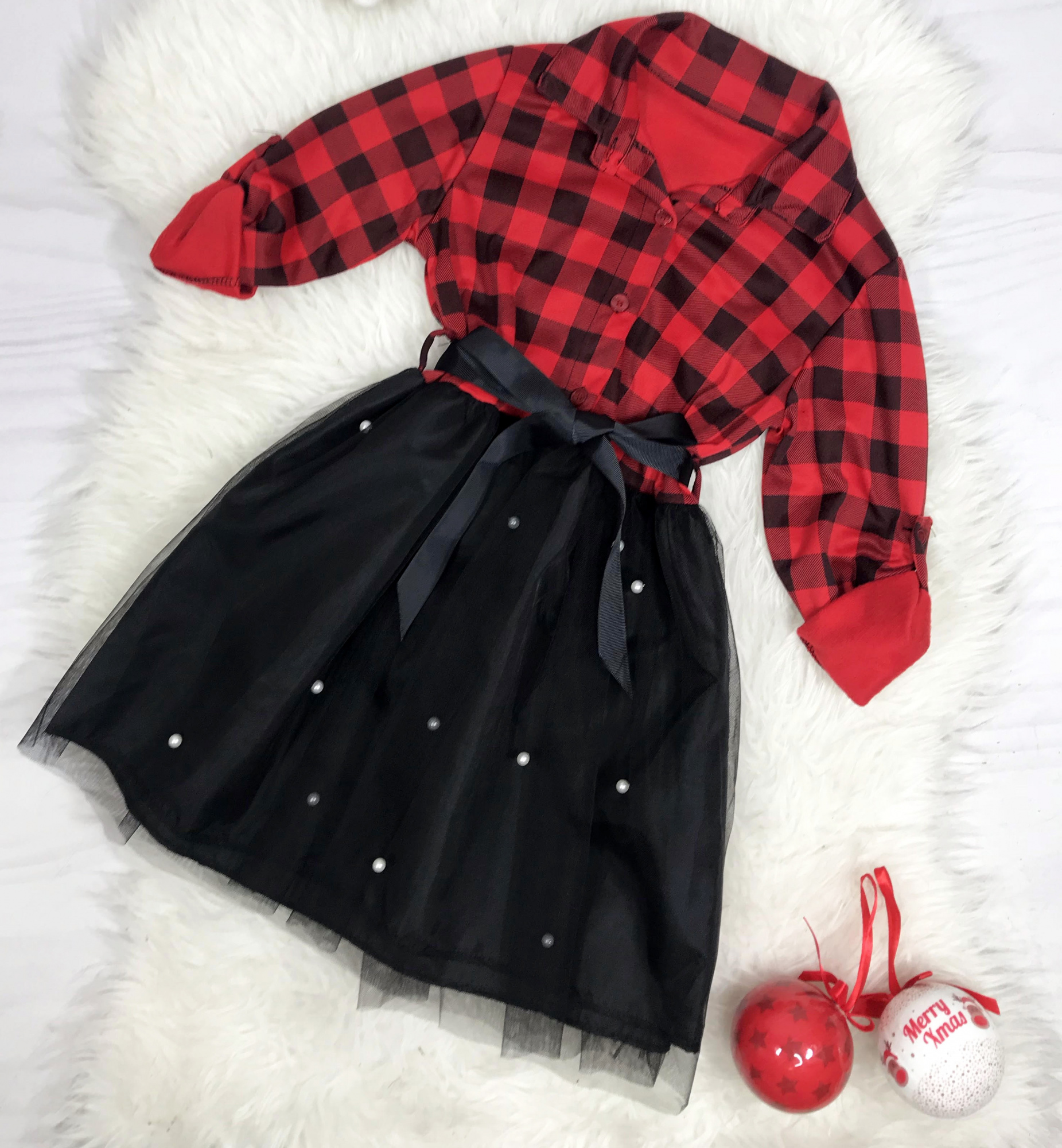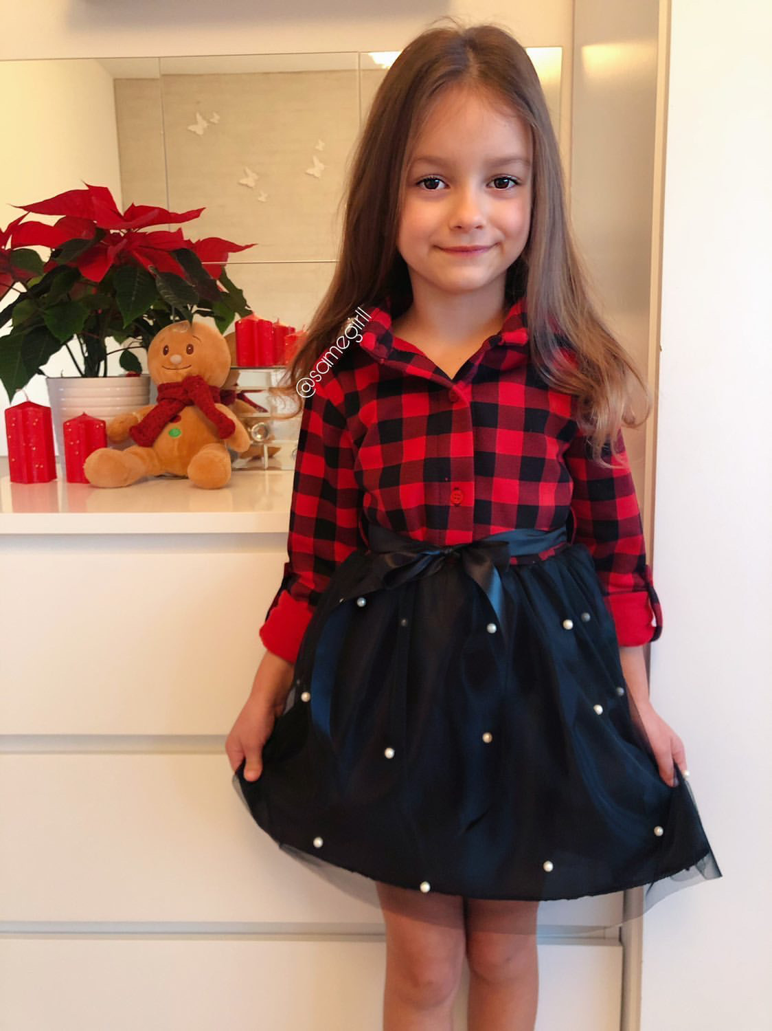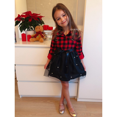 • góra w formie koszuli w kratkę, dół z tiulem na podszewce z przyszytymi perełkami
