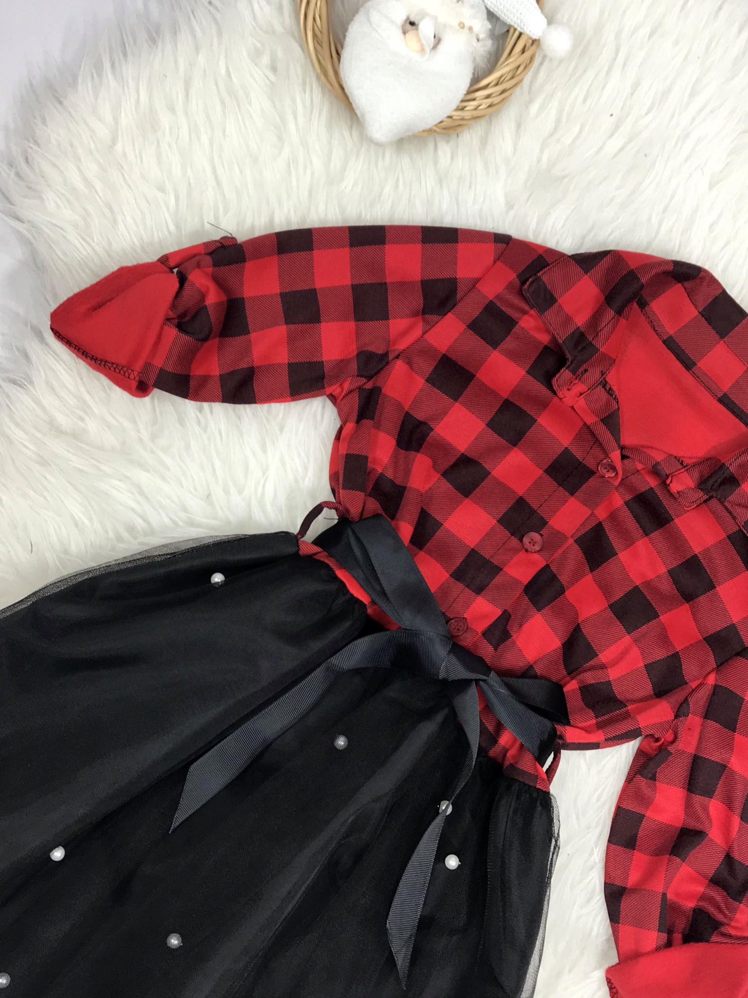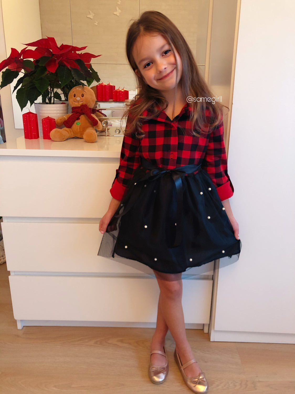 • góra w formie koszuli w kratkę, dół z tiulem na podszewce z przyszytymi perełkami