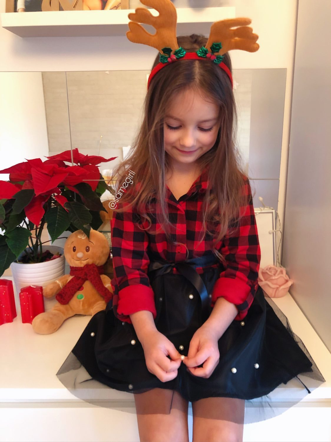 • góra w formie koszuli w kratkę, dół z tiulem na podszewce z przyszytymi perełkami