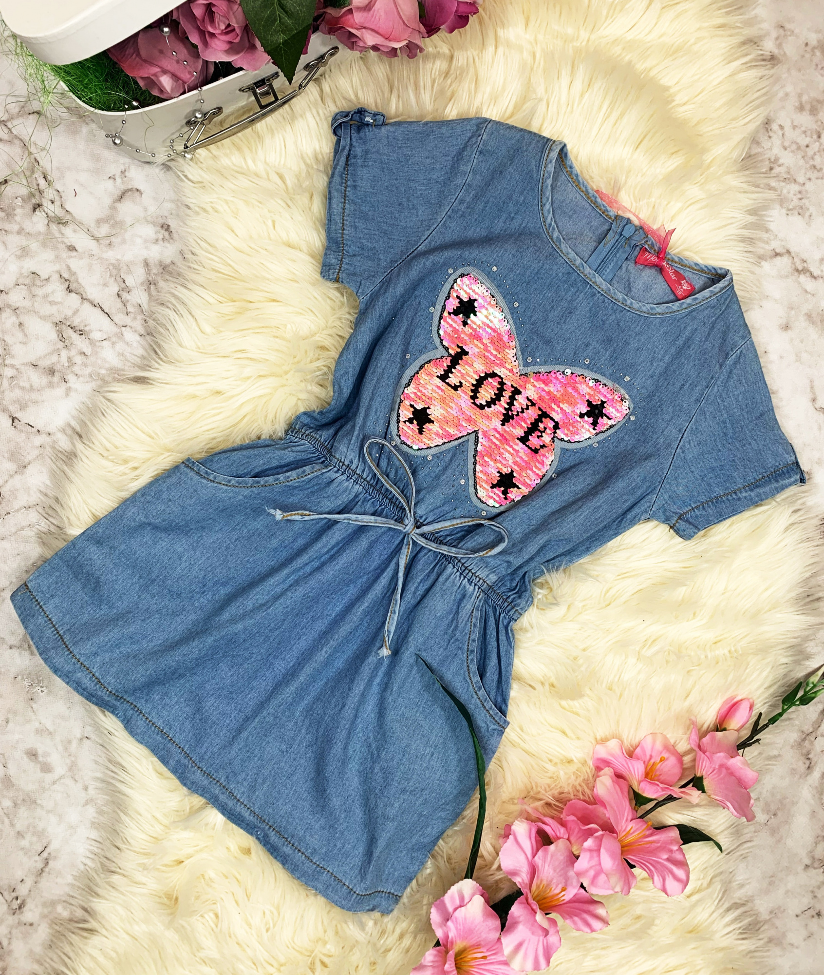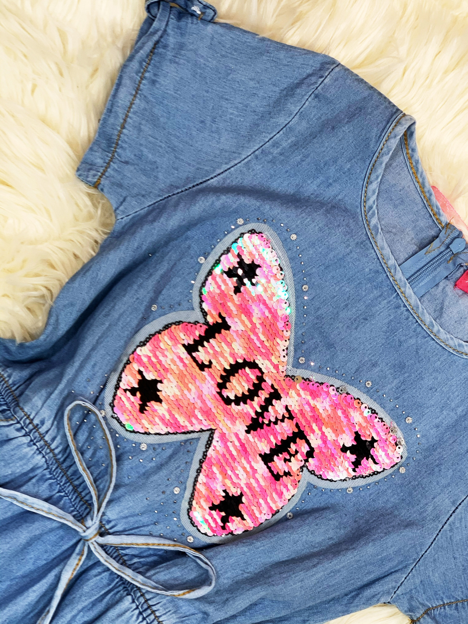 • ozdobiona dżetami i motylem z dwustronnych cekin