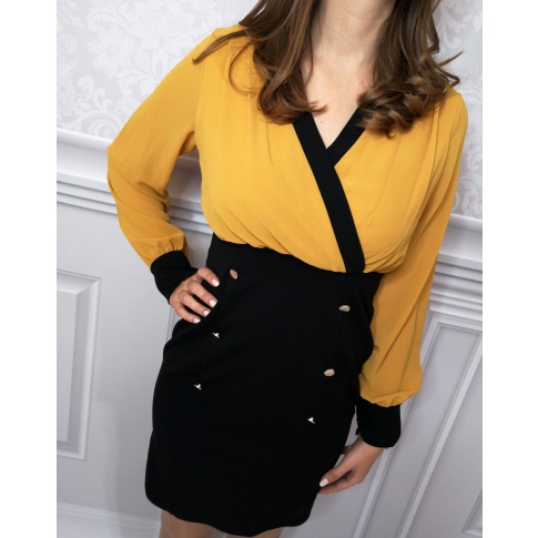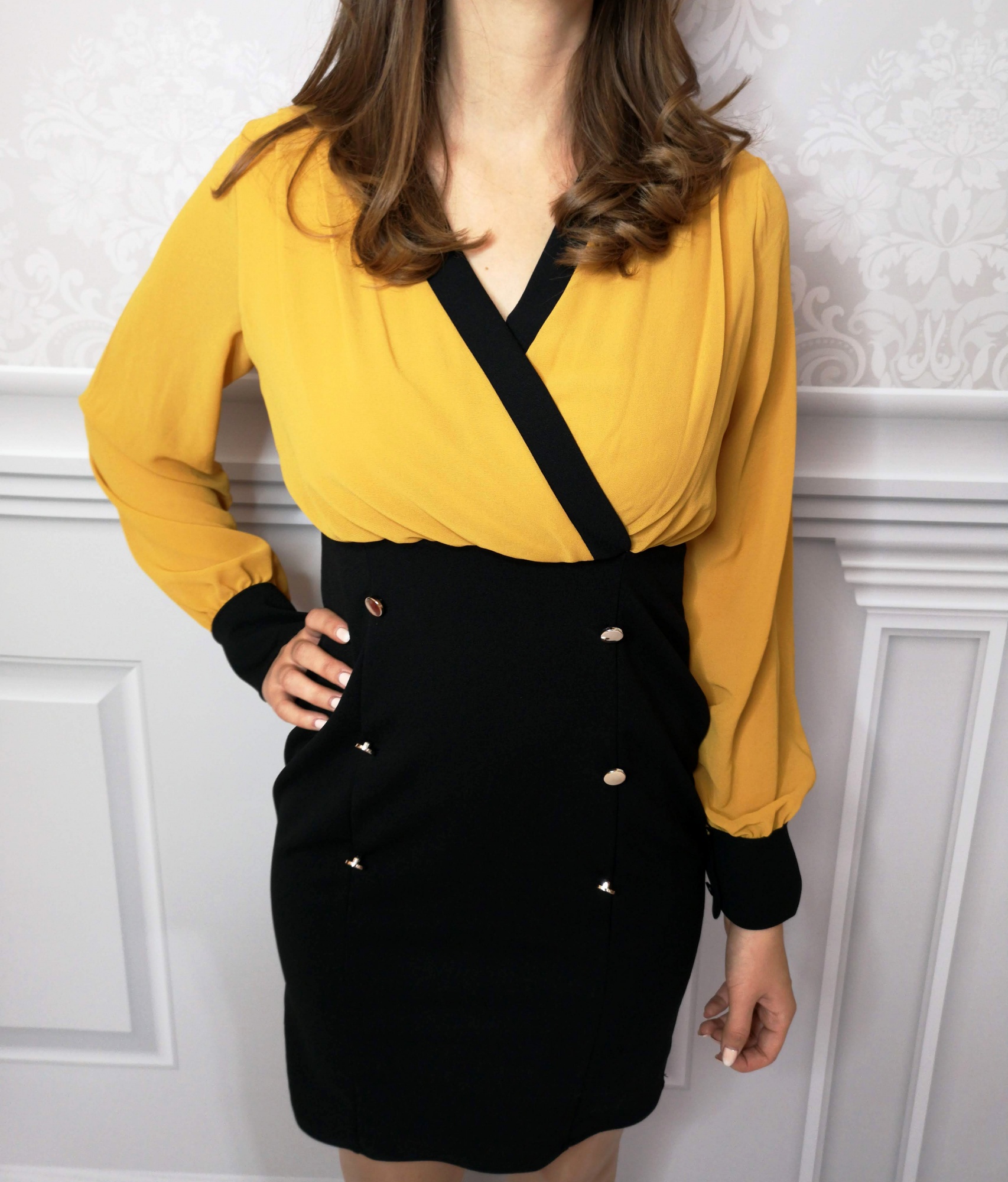 • dół sukienki, czarna spódnica ozodobiona złotymi guziczkami