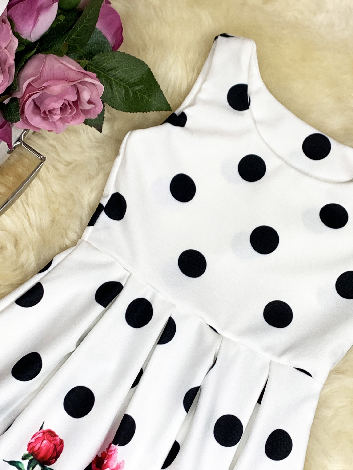 • zdobiony czarnymi kropkami, na dole ciekawy kwiatowy print