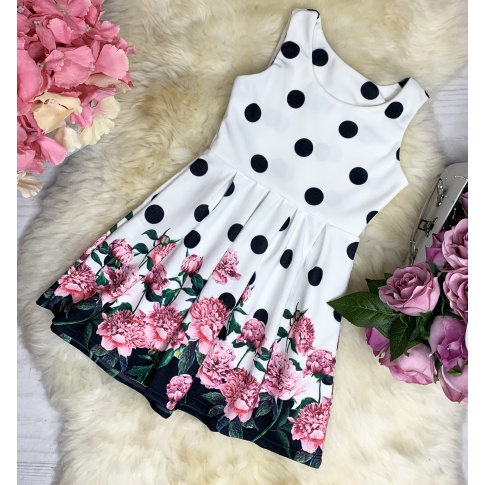 • zdobiony czarnymi kropkami, na dole ciekawy kwiatowy print