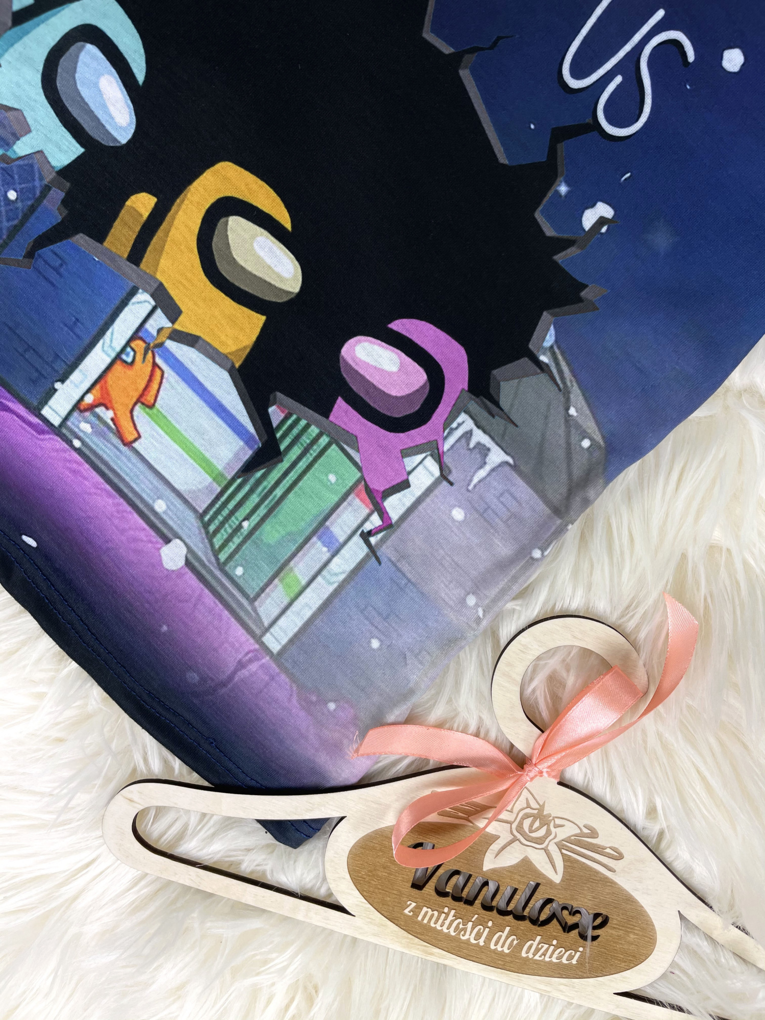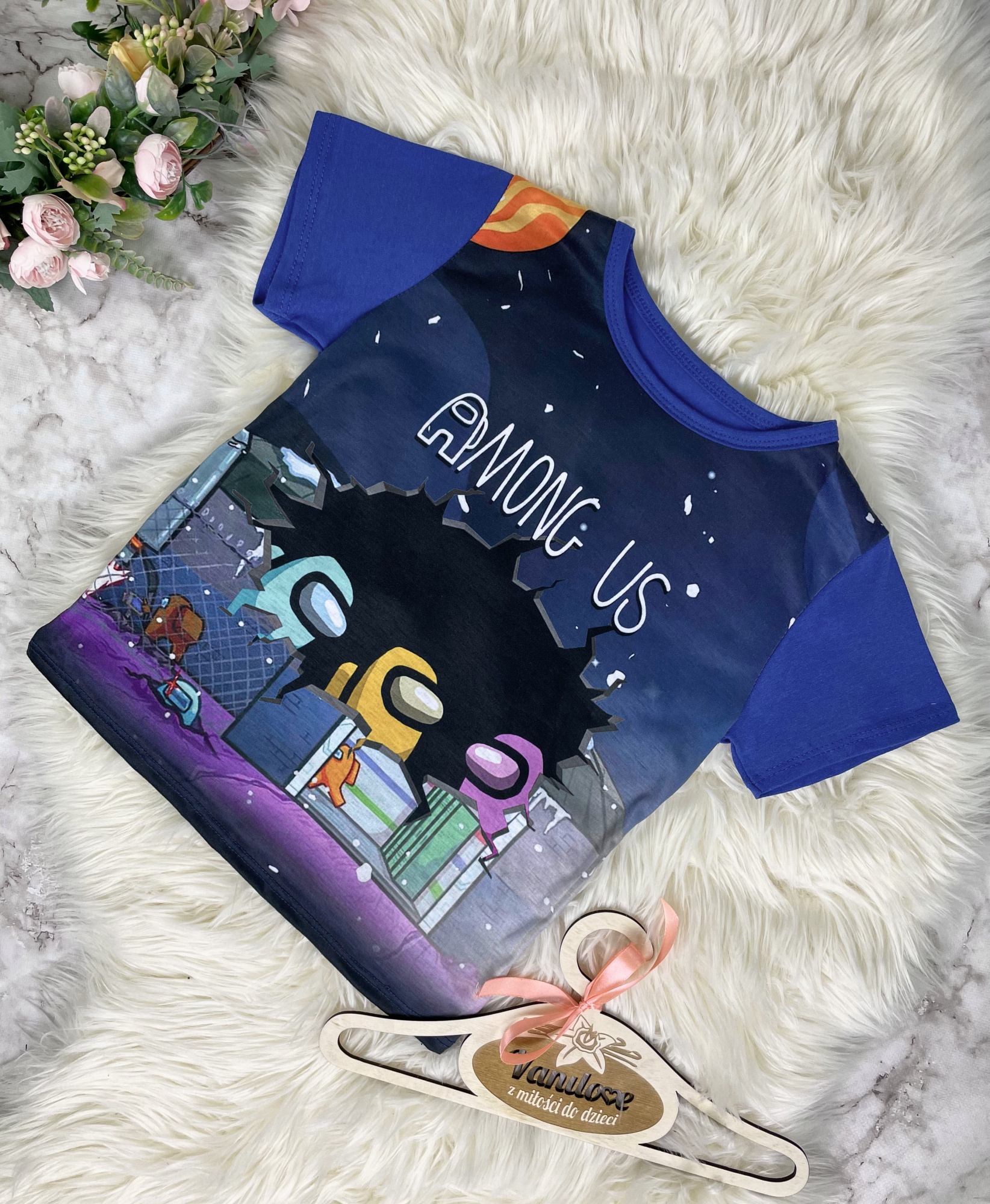 • z przodu T-shirt zdobiony kolorowymi nadrukami z gry Among Us