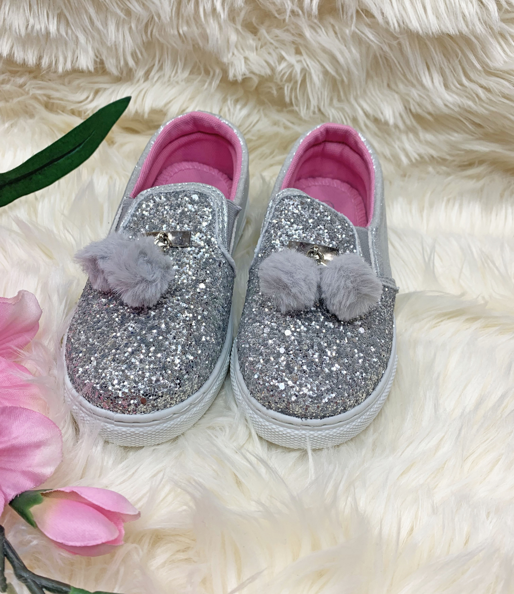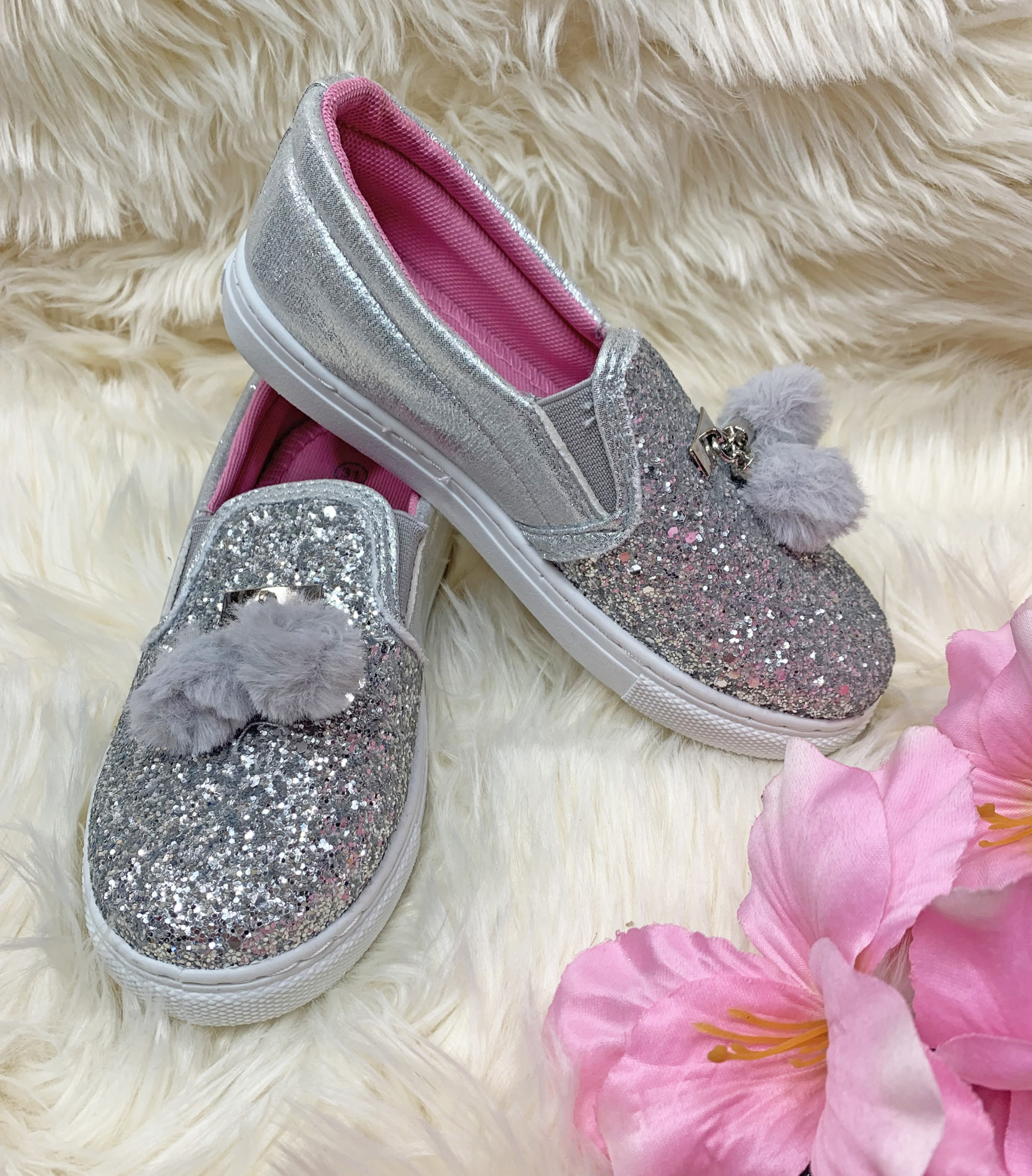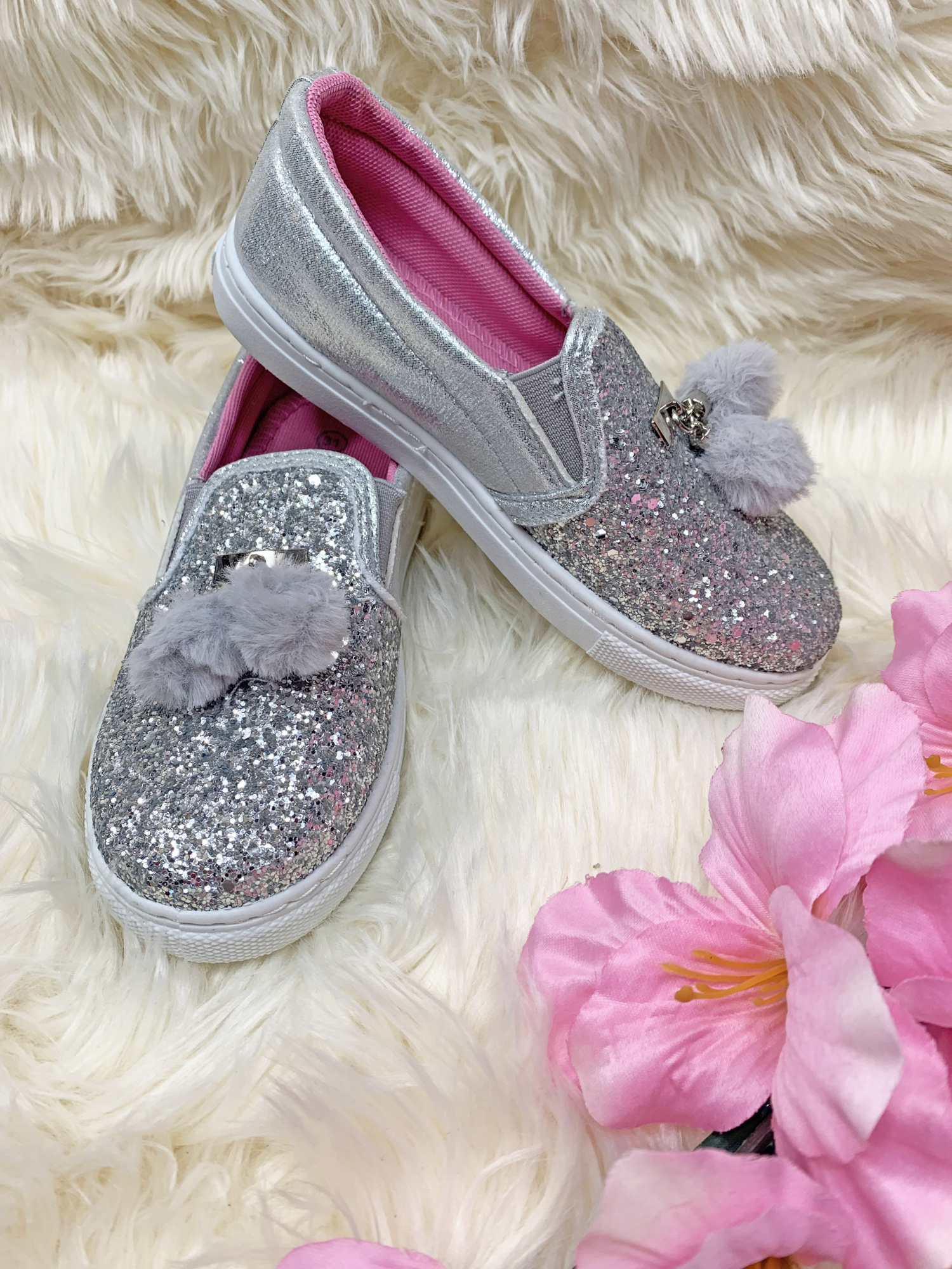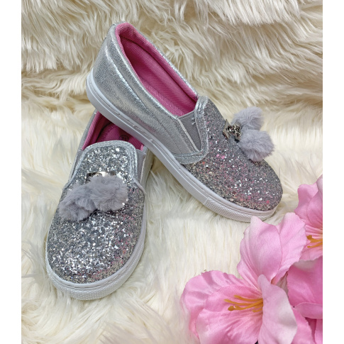 Trampki wsuwane z pomponikami Brokat - Srebrny