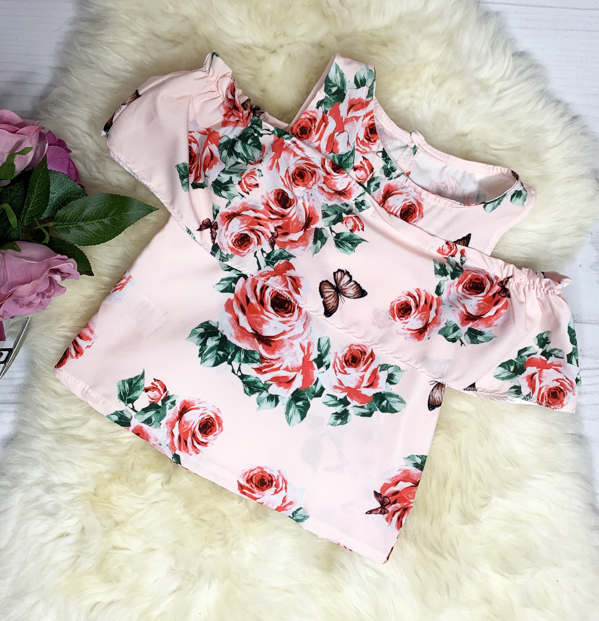 • bluzeczka z lekkiego materiału z wyciętymi ramionami oraz falbanką