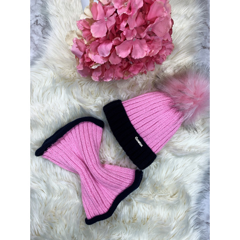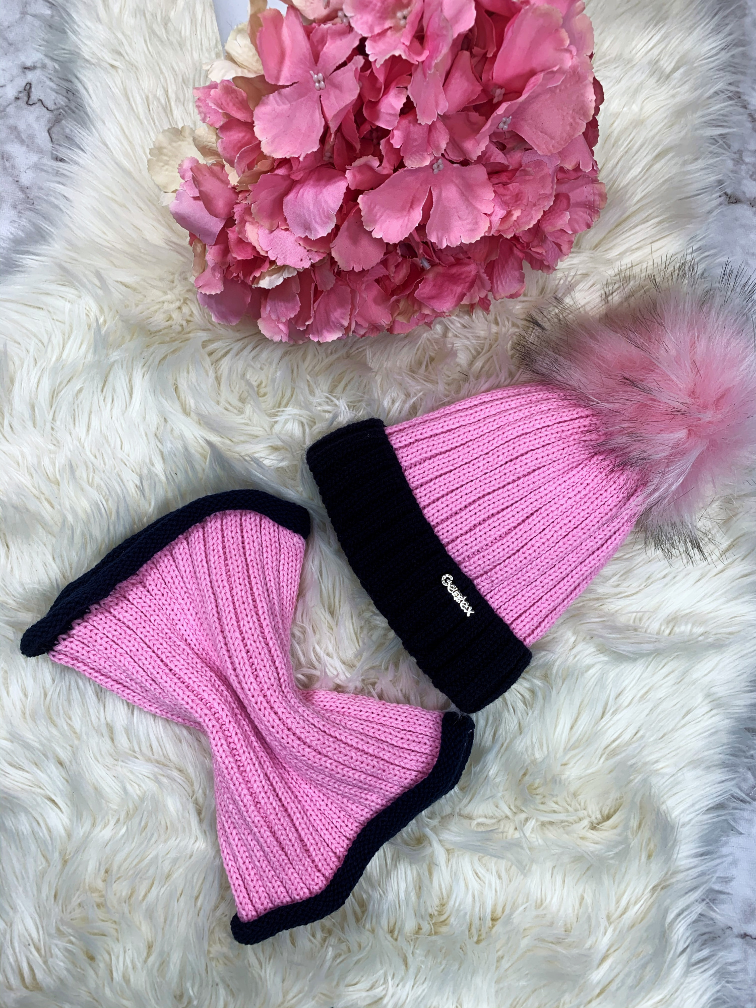 WINTER Dziewczęcy Komplet Czapka + Komin Granat+Roż