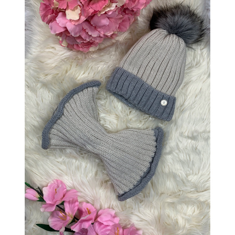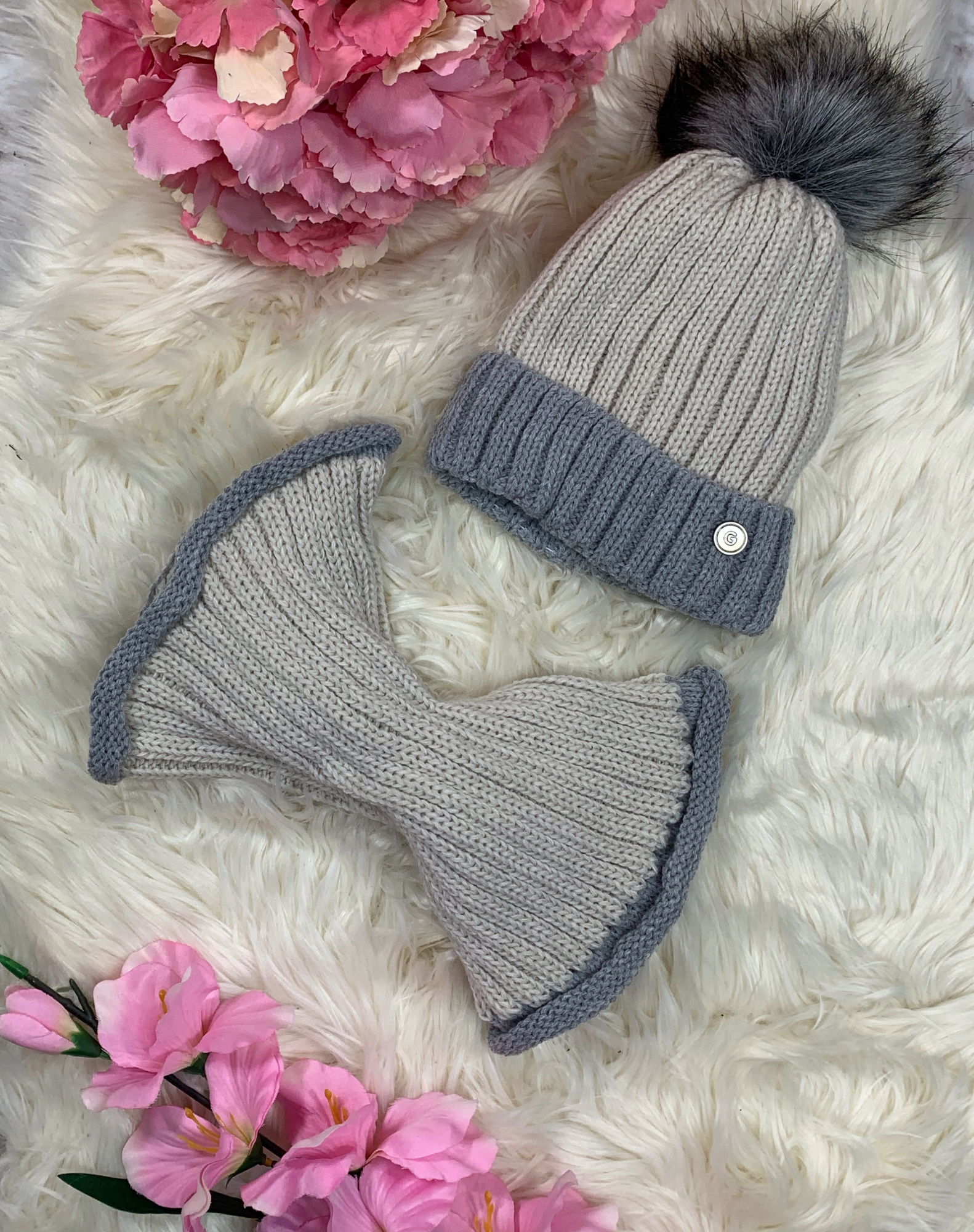 WINTER Dziewczęcy Komplet Czapka + Komin- Szary + Beż