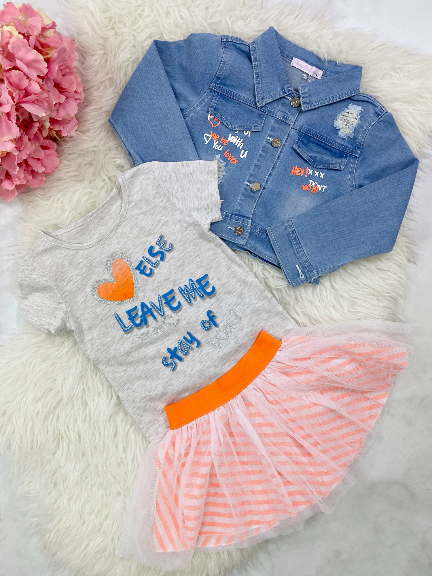 • wiosenny komplet składający się z trzech części: kurtka jeansowa, bluzka oraz spódniczka