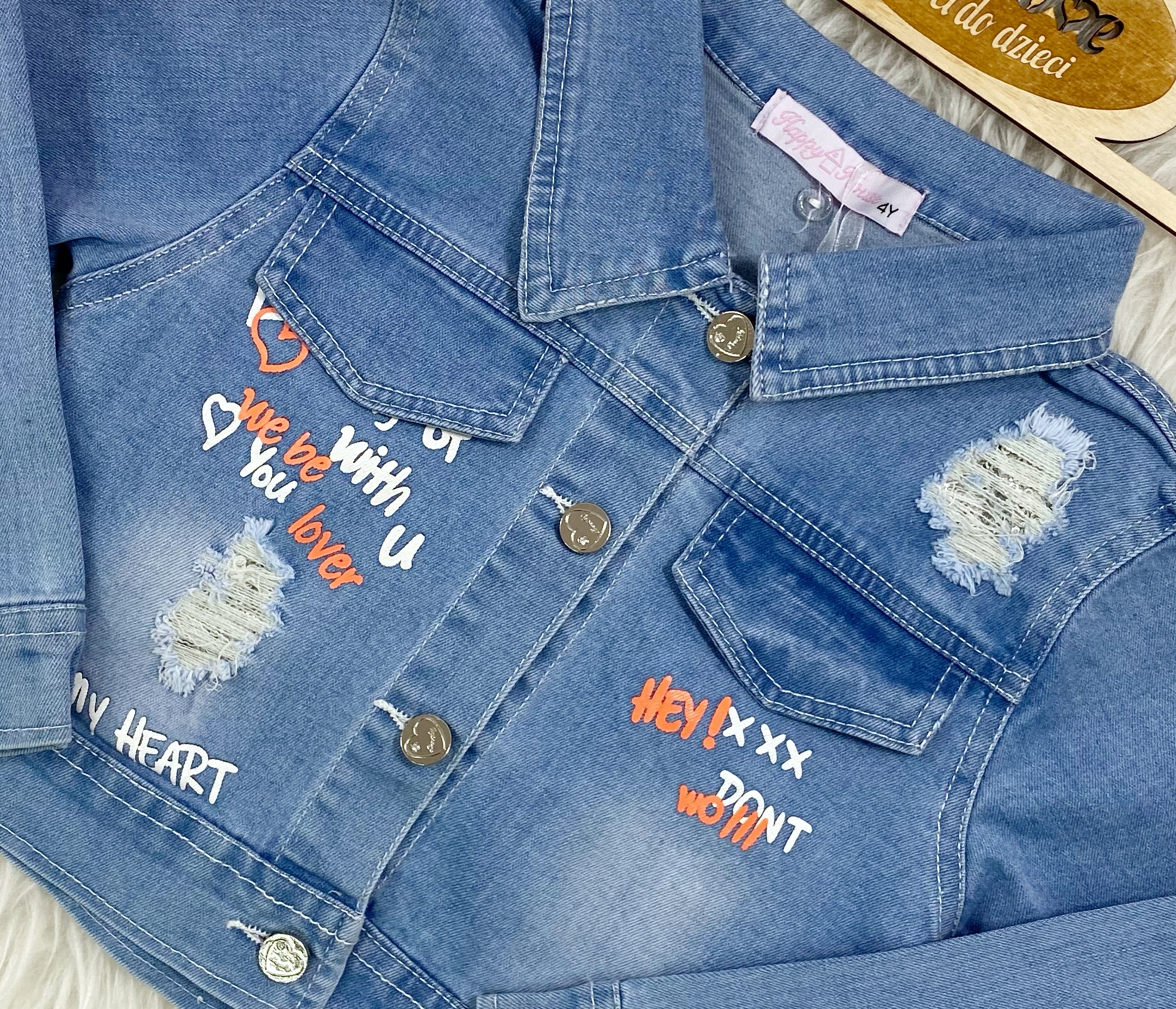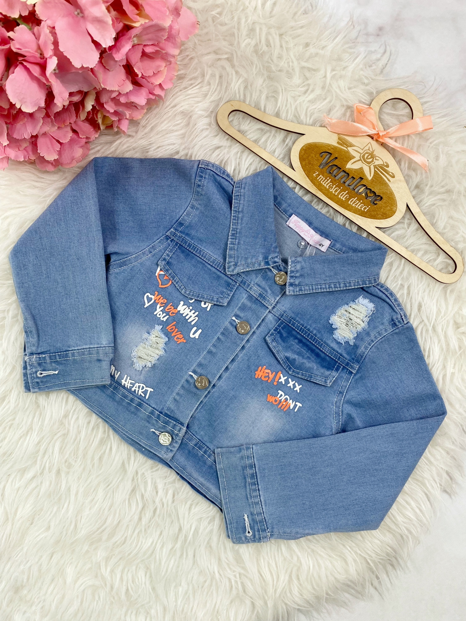 • kurtka jeansowa wykonana z miękkiego i elastycznego jeansu, zapinana na guziki, zdobiona modnymi nadrukami